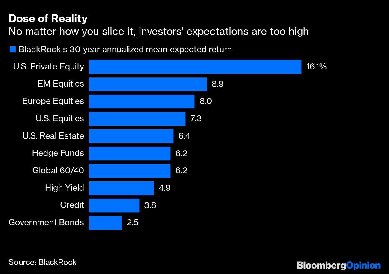 从中期来看,结果可能会更加差强人意,因为很多资产都很贵了,而且估值过高往往会拖累未来回报。因此,黑石估计未来 5 年或 10 年大多数资产类别的回报会更低也就不足为奇了。从好的方面来说,就像黑石的估计所表明那样,投资者可以通过增加对非美国股票的敞口来提高预期回报,因为这些股票不像美国股票那么受欢迎,所以定价更加合理。即便如此,如果债券市场每年约 2% 的通胀预测是可信的话,那么大多数投资者可以预期的回报率仍然是每年 7% 至 8%,或者扣除通胀后的 5% 至 6%。