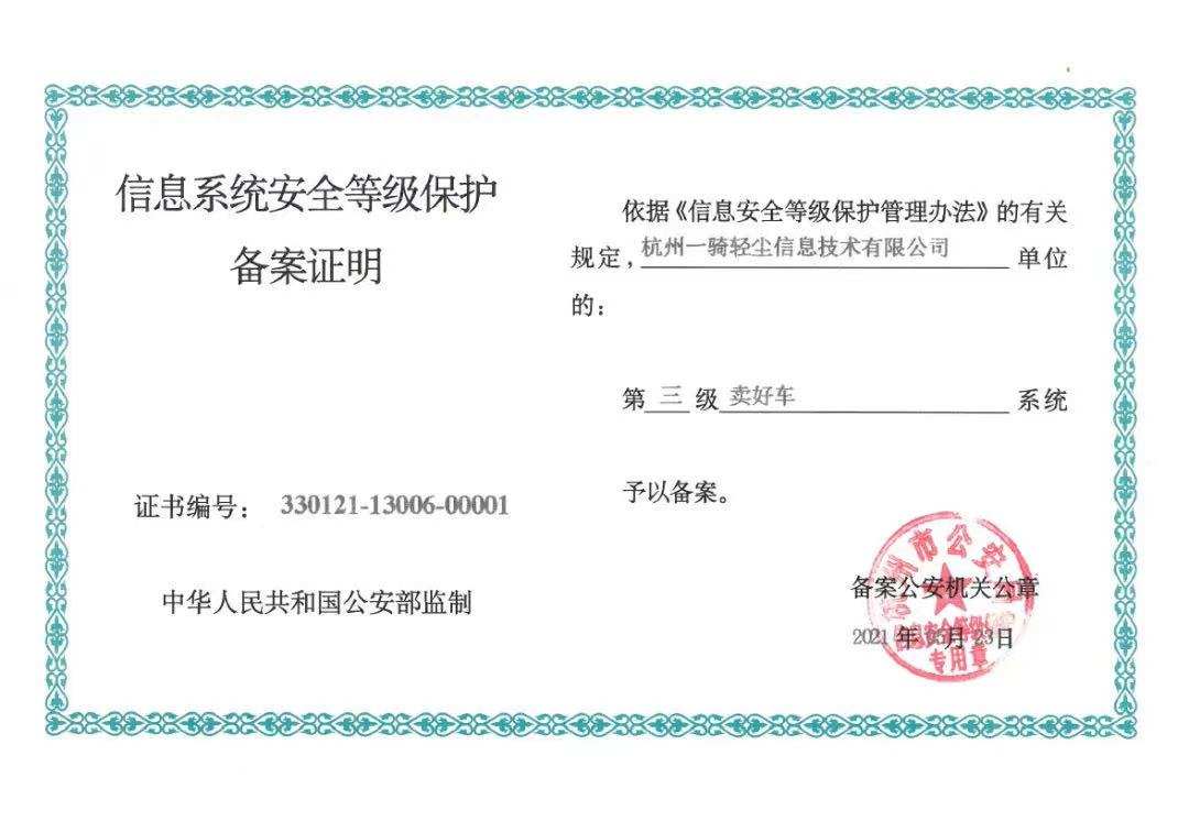 不久前,卖好车正式获得由公安部核准颁发的“信息系统安全等级保护第三级备案证明“,这是国家对非银行机构信息系统安全的最高级认证证明,代表卖好车平台的信息系统安全技术能力已经达到“监管级别”,卖好车平台在技术安全、系统管理、应急保障等方面符合国家标准。