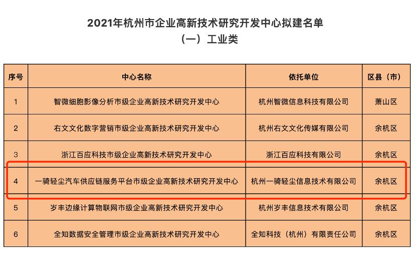 近日,杭州市科学技术局公示了“2021年杭州市企业高新技术研究开发中心拟建名单”,在余杭区科技局评审推荐的基础上,经市局组织专家实地考察审核,杭州一骑轻尘信息技术有限公司(即“卖好车”)申报的“一骑轻尘汽车供应链服务平台市级企业高新技术研究开发中心”,符合2021年杭州市企业高新技术研发中心建设条件,成功上榜。这标志着卖好车的科技实力再次获得官方认可。