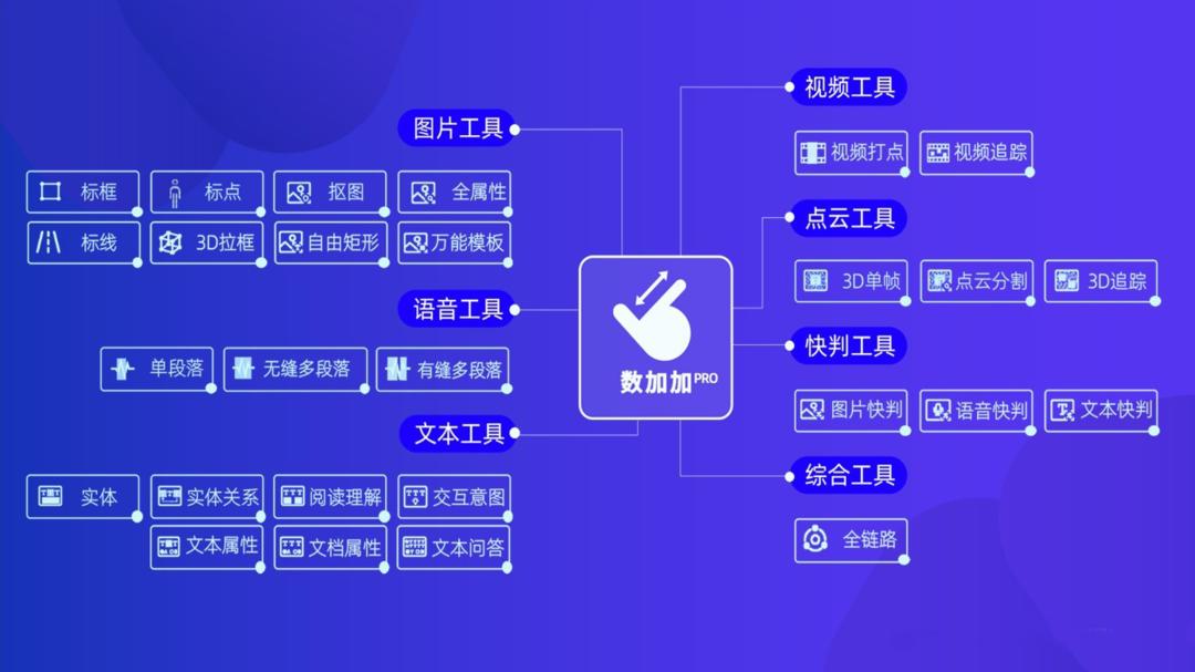 针对每种数据类型下的不同标注任务,数加加Pro自研四十套标注模板工具,全都都是经过多年打磨及实战检验,高效满足语音、图片、文本、视频、点云的复杂需求。