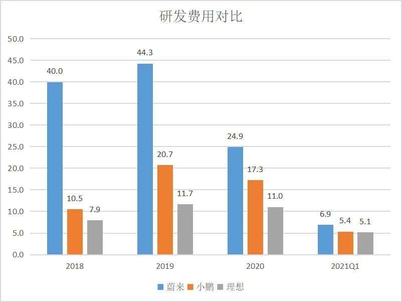 造车的烧钱流露在生产线上的方方面面,可无论任何,技术创新才是提高竞争力、树立品牌护城河的核心动力。关于2020及2021Q1的亏损,理想归因给了研发与营销费用。而在研发费用方面,理想受益于增程式优先战略,支出常年低于蔚来及小鹏,在今年一季度确定重视高压纯电路线后才开始增加投入。