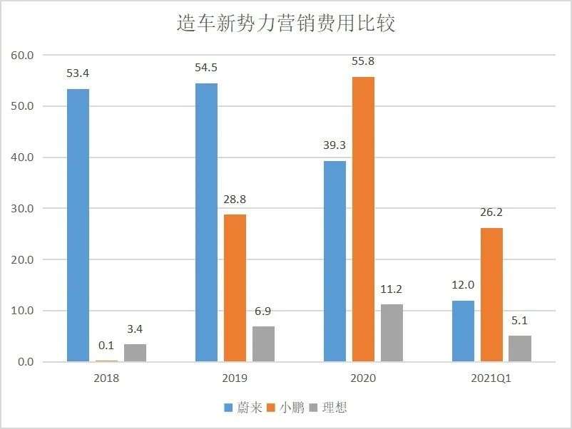 营销费用的增长也不可小觑。2021一季度,理想投入5.1亿元,同比增长277.7%,蔚来、小鹏则分别投入12.0亿元、26.2亿元。尽管理想汽车的市值在蔚小理三家中居于末位,但抢占市场的征程,不进攻就意味着失守,想要布局未来,就不太可能在营销费用上做节流打算,此起彼伏下,以后的花销只会更大。
