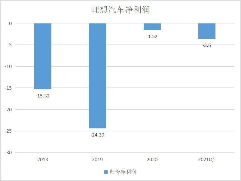 从这个角度看,二级市场保守看待理想就不难理解。依照理想向港交所提交的招股书,它迄今为止仍然只有理想One一款车型,业绩更是始终不曾脱离亏损阴霾。2020年,理想汽车终于在毛利指标上实现扭亏为盈,归母净利润的表现却一直不甚理想,2020年有所收窄的净亏损昙花一现,最新数据显示2021Q1的亏损扩大到了3.6亿元,超过2020全年。