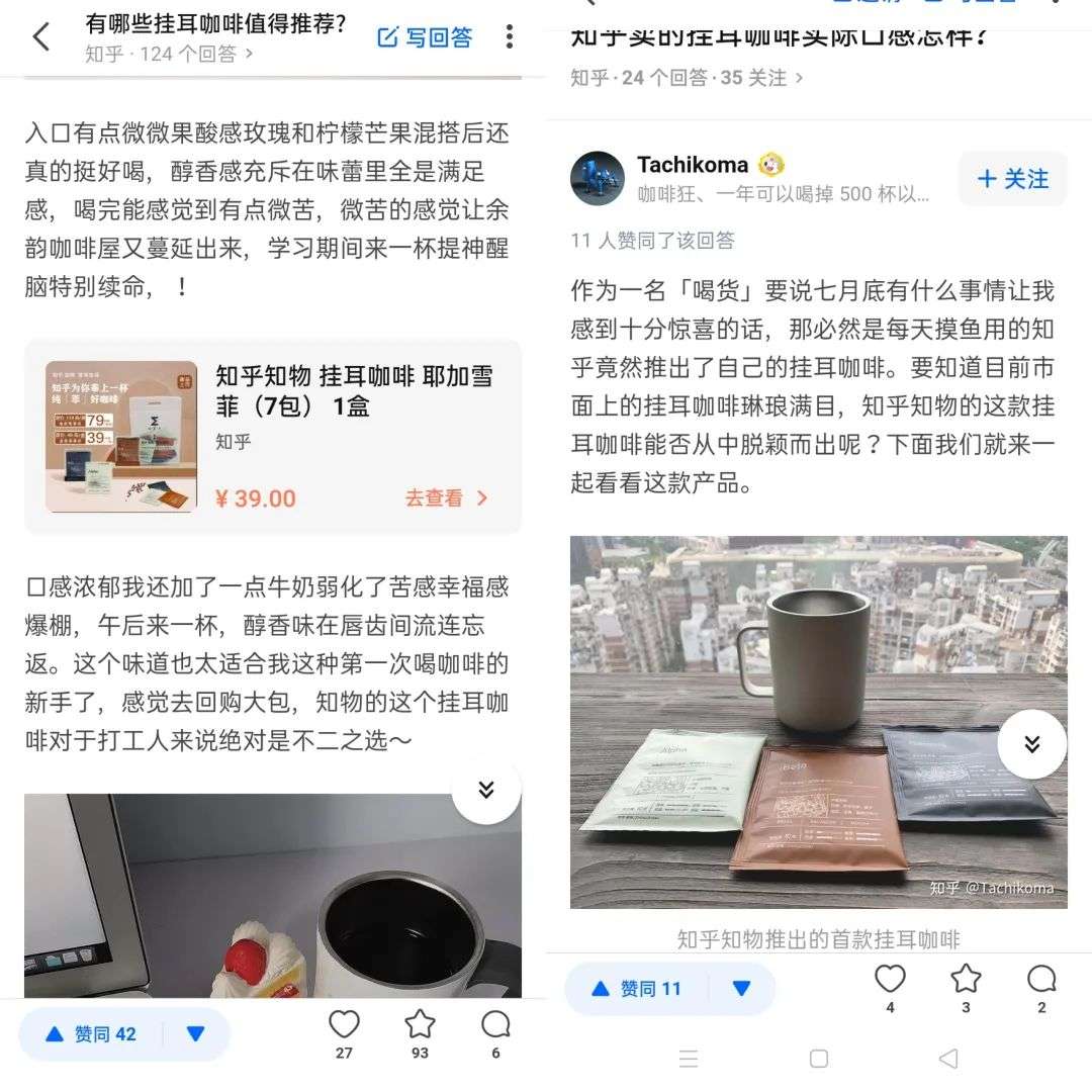 据猎云网报道,知乎在新品上市前,邀请多位咖啡领域答主试喝,并在平台上发起众测活动。用户在试喝后,还需要在平台选定的“有什么好喝不贵的咖啡”“有哪些挂耳咖啡值得推荐”“咖啡上瘾是什么感觉”等问题下发布体验报告,并在内容中插入指定的好物推荐卡片。