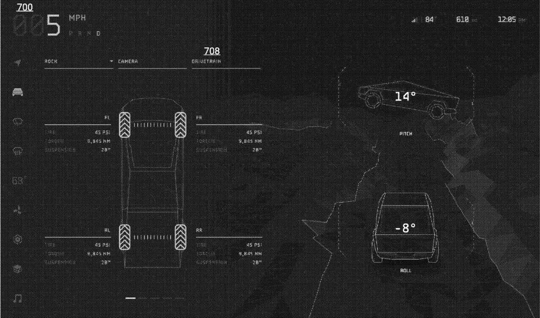 17 寸的中控屏中,实际上会有多少东西现在还是未知。发布会当时的实拍视频给到的参考价值也有限。但是,今年 5 月份出现的专利申报文件中,出现了许多暗示 Cybertruck 独特功能的车机 UI 示意图。