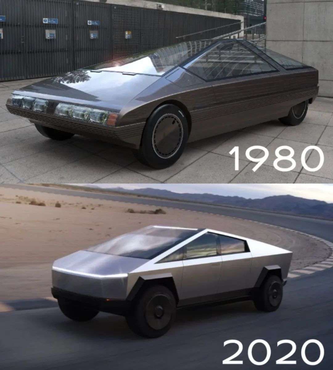 丑也不要紧,反正够独特就好。如果你觉得三角形车顶是个划时代的设计,显然你错了。因为 Cybertruck 和 40 年前的雪铁龙 Karin,有着如出一辙的金字塔穹顶造型。一旦你在这两台车的设计语言上发现了跨越时空的共鸣,也就不会觉得 Cybertruck 惊艳了。