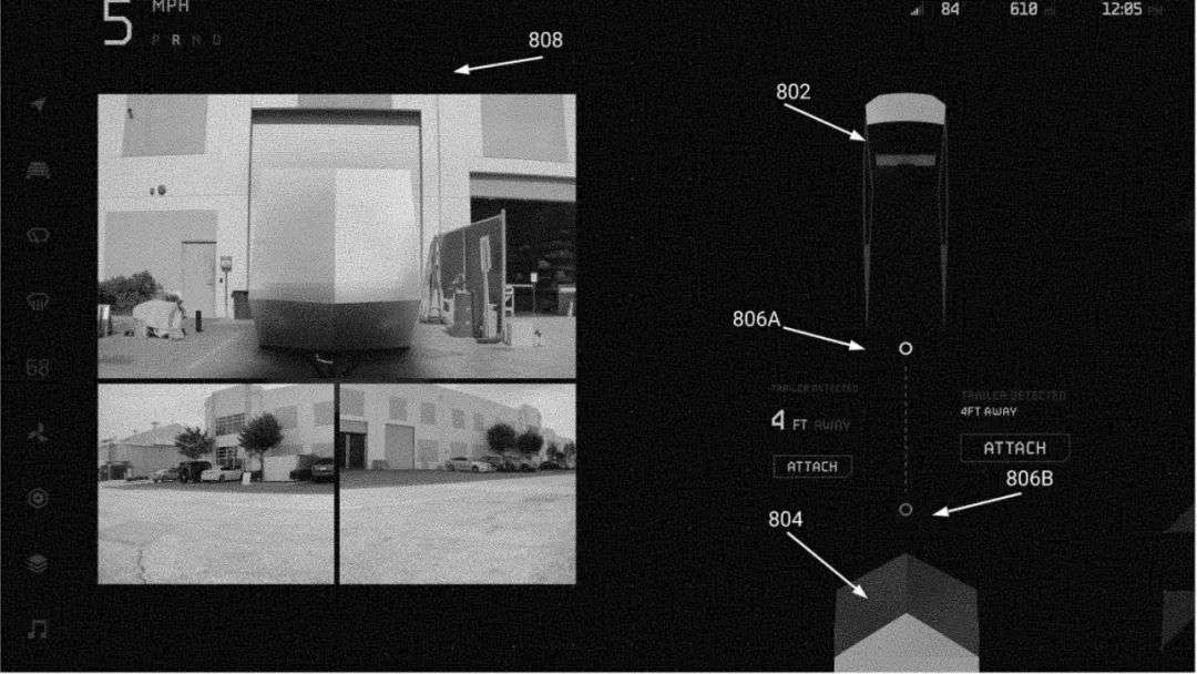 前文出现的官图中的拖车,也在这个拖车信息界面中出现,背景显然是特斯拉厂区。虽然还是传统的特斯拉三视角倒车画面,但右边的界面里出现了「TRAILER DETECTED」的字眼,表示特斯拉皮卡有识别配套拖车距离的能力。