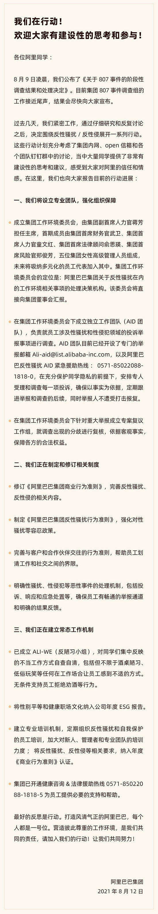 在事件发生之后,阿里巴巴员工在内部建立了一个讨论群,发出联合倡议,建议之一是“推动员工、特别是女性员工职场反性骚扰/反性侵制度的建立”。