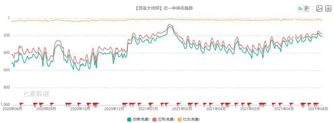 《百变大侦探》近一年不仅在免费社交应用下载榜榜上的排名稳定在TOP30,在总榜上的排名更是趋于上升的,随着剧本杀行业持续发展,这一趋势估计并不会太早结束。