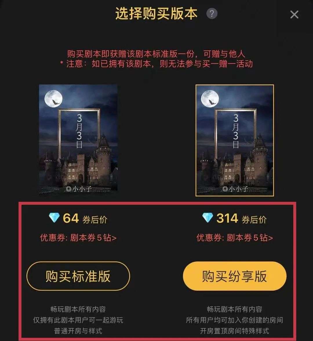 盒装:向所有线下门店不限量售出,一般售价300-600元,这类剧本杀内容量和难度都有较大跨度,创作时间约 1 个月;