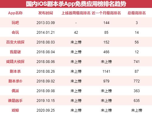 从表上可以看出,最高排名进入过TOP100的仅有《百变大侦探》《我是谜》《玩吧》《会玩》和《剧本杀》。
