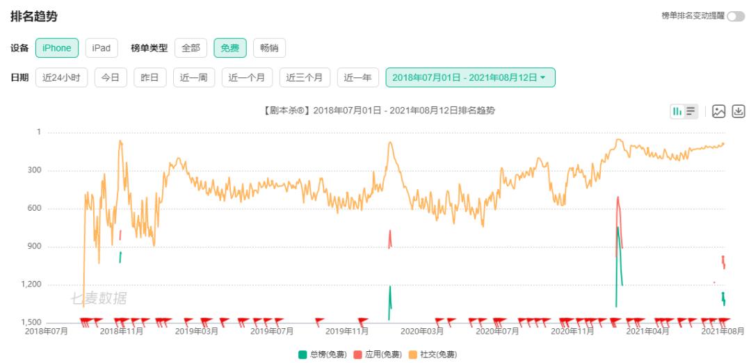 根据七麦显示,《剧本杀®》在游卡网络手里时,其在iOS免费社交应用的排名难有突破TOP300,而在成森网络接手后,在榜上的排名逐渐靠前,如今稳定在TOP200,但距离头部产品还有一些距离。