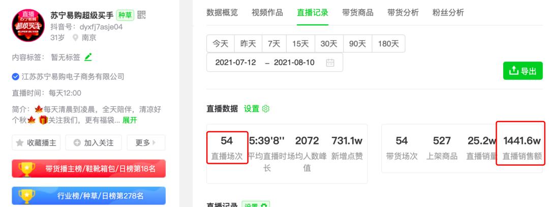 援引飞瓜平台的数据来看,近一个月内(7.12-8.10),苏宁易购超级买手抖音直播间带货场次54次,预估直播销售额仅为1441.6万。