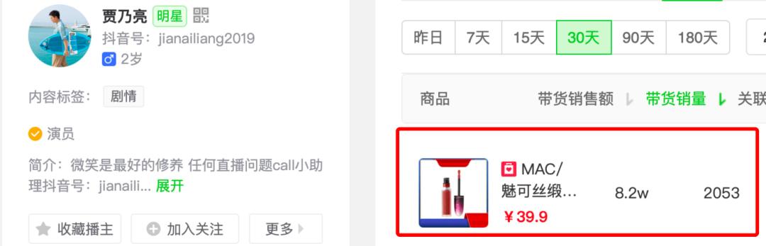 然而与在苏宁的直播间不同的是,这次的福利,贾乃亮需自掏腰包补贴。以直播间一款限量版MAC丝缎柔雾唇釉口红为例,原价210元,直播间福利价为39.9元。贾乃亮在直播间透露,每管口红要自掏腰包补贴一百多元。飞瓜数据显示,此款口红共卖出2053支,带货销售额为8.2万。按照贾乃亮的说法,这一款产品要补贴20万以上。