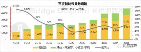 当前,百度的创新业务其实来源于百度的智能云业务:百度二季度云业务同比增长71%以上,单季收入38亿。