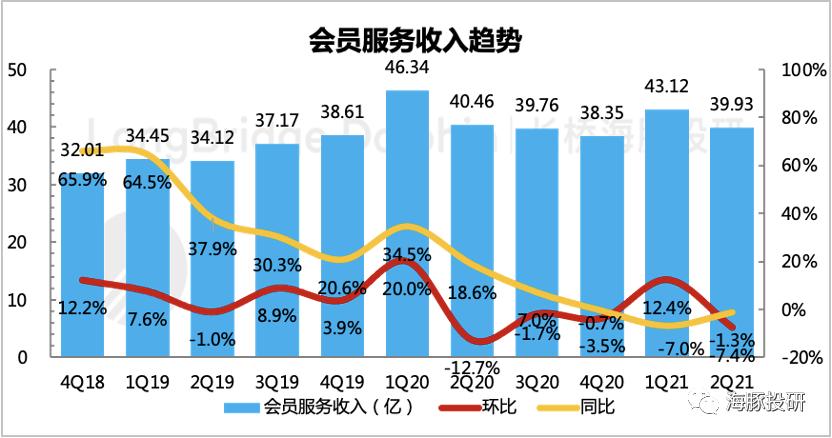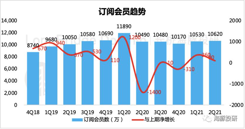 或受促销活动影响,会员ARPU本季度环比有所下滑,从而抵消了部分会员增长效果,整体订阅收入40亿,同比下滑1.3%。
