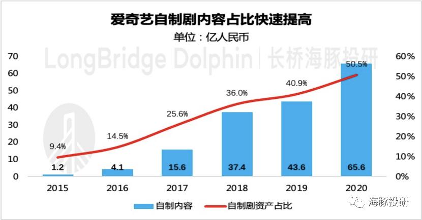 目前爱奇艺自制剧资产占比已达到50%,在5月开展的2021世界大会中,公布了近200部作品,其中近60%属于平台自制内容。CEO龚宇表示,未来一到两年内,公司的目标是将头部自制剧集的占比提升至60%至70%。