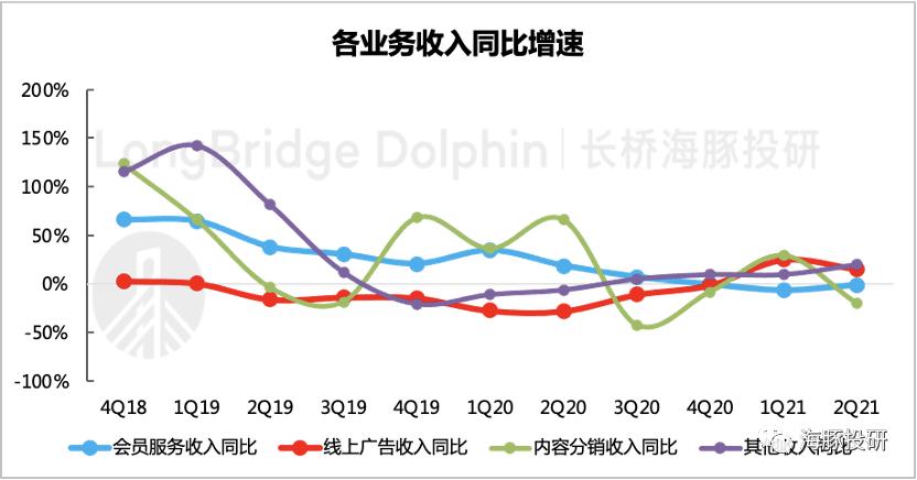 这也可以从业务拆分之后的增长情况看出来,二季度广告收入、内容分销收入在去年低基数下,仍然出现了同比下滑。