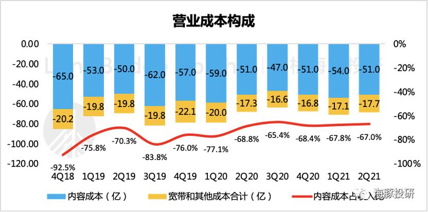 而二季度宽带及其他成本的投入则同比有所增长,从而使得整体成本达到69亿。