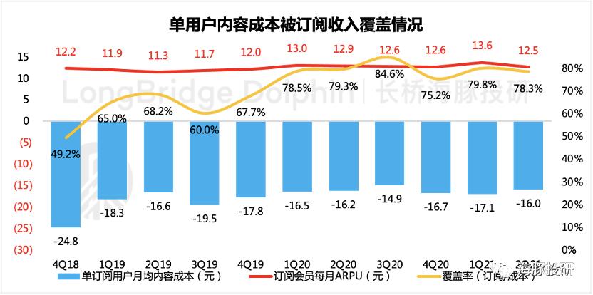 其次,在单会员ARPU上,二季度环比有所下降,这或许与二季度爱奇艺会员促销、联名会员活动较多有关。由于单用户ARPU下降的幅度超出了内容成本的优化效果,引起二季度订阅收入覆盖成本情况并没有如期好转。不过,短期的扰动因素不排除存在偶发性。