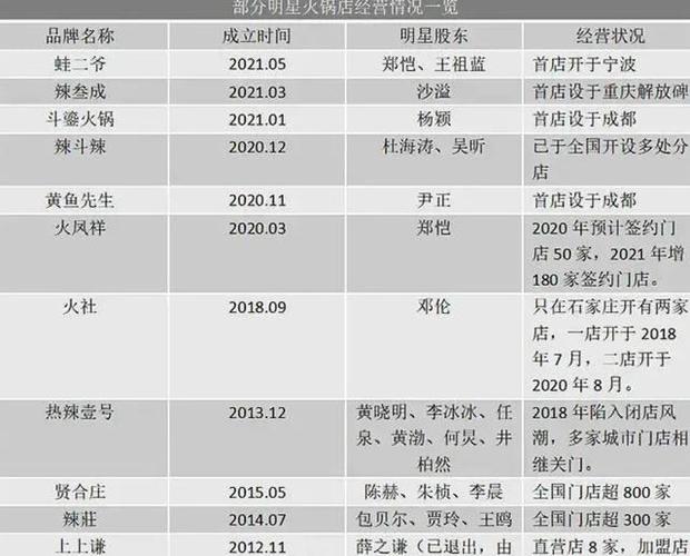陈赫的“贤合庄”,薛之谦的“上上谦”,杨颖的“斗鎏火锅”,沙溢的“辣叁成”,杜海涛的“辣斗辣”,胡海泉的“灥喜锅”……其中“贤合庄”可谓其中的“王者”,从2015年开业,如今全国门店已超800家。2020年10月,郑恺、王祖蓝的“火凤祥”第一家店开业,短短2个月加盟店数量达到50家。