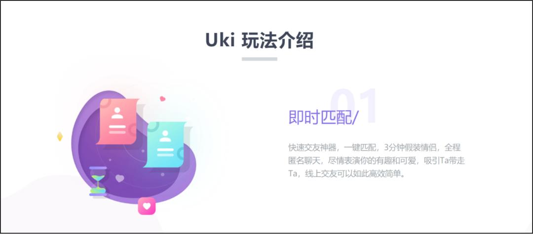 uki软件也做了类似探索。一键即时匹配,3分钟假装情侣,全程匿名聊天。3分钟后如果满意,可以开启畅聊。这让用户快速试错和匹配,因兴趣而始。