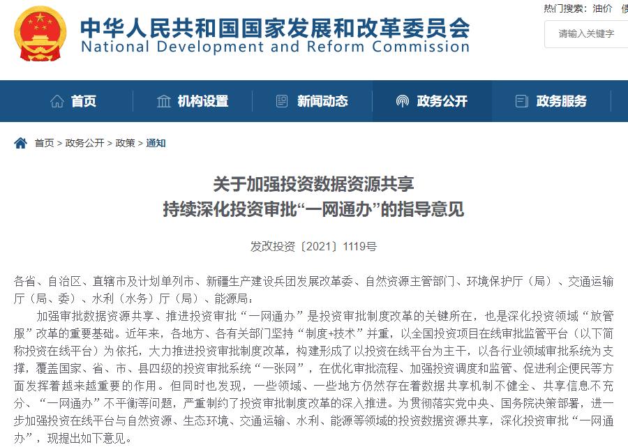 为落实党中央、国务院关于深化投资领域“放管服”改革、加强投资审批数据共享的精神和要求。7月28日,国家发展改革委会同自然资源部、生态环境部、交通运输部、水利部、国家能源局联合印发《关于加强投资数据资源共享持续深化投资审批“一网通办”的指导意见》(以下简称《意见》)。《意见》中明确指出:投资在线平台要积极推广应用电子印章,拓展投资在线平台功能,进一步减少企业重复提交、部门重复核验,提升固定资产投资审批服务便利化水平。