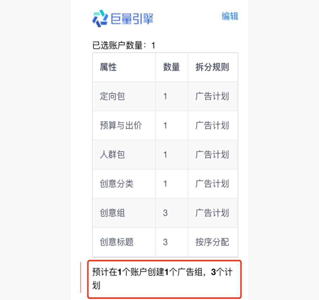 举个例子,设置「定向包」、「预算与出价」、「人群包」按照广告组维度拆分,其余按照广告计划维度拆分,则会生成如下广告组和广告计划: