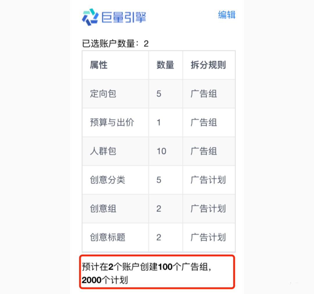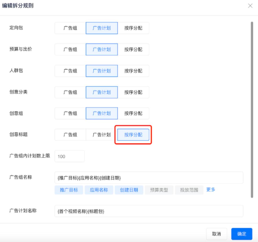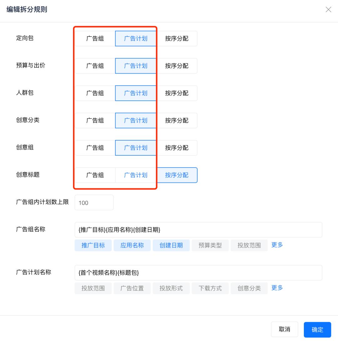在创建广告计划前,可提前设置拆分规则。我们可以将「定向」、「预算&出价」、「人群包」、「创意分类」、「创意组」、「标题组」等属性设置按照「广告组」或「广告计划」的维度进行拆分。通过叉乘功能,只需设置一次,即可拆分成百上千条广告组或广告计划。