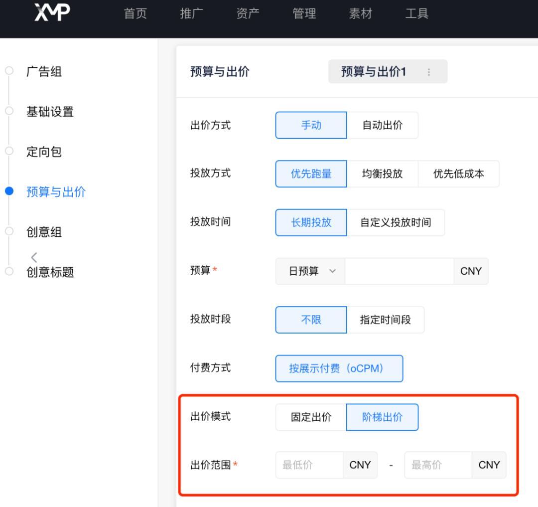 在设置阶梯出价范围后,XMP 可以根据广告计划数量自动设置每个广告计划的出价。快速找到最优出价,更易起量。