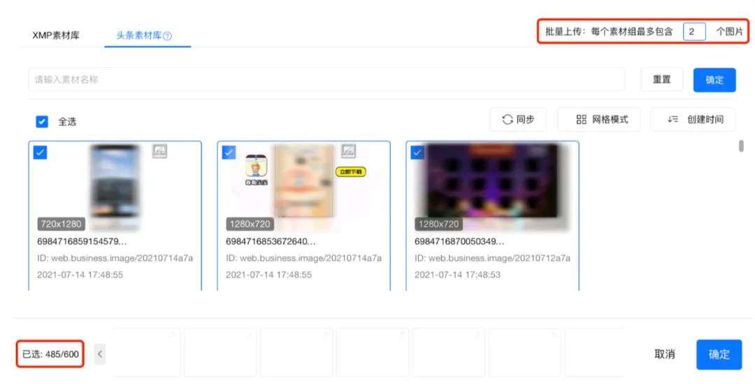 在一键批量上传素材后,设置每个素材组最多包含指定数量素材,XMP 就能自动分配素材至不同的广告组或广告计划。快速批量测试素材,保证账户下素材的多样性,快速起量。