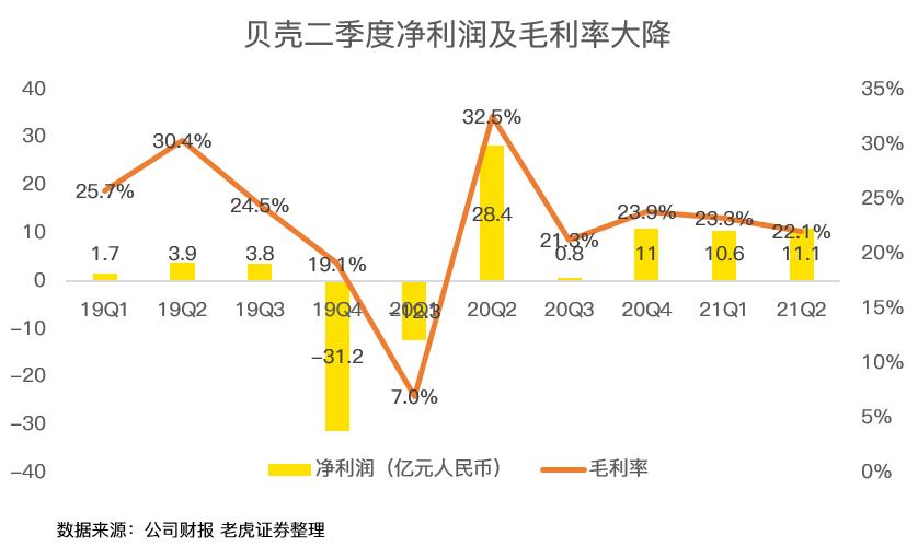 但贝壳的净利润及毛利率从财务数据上看出现暴降:二季度贝壳的净利润为11亿元,同比去年二季度的28.4亿,大降61%;二季度毛利率只有22.1%,远低于去年同期的32.5%,也低于今年一季度。