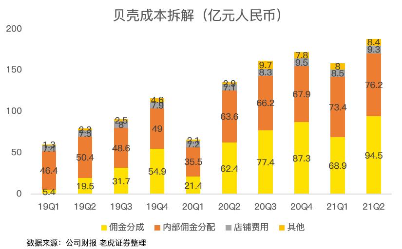 二季度,贝壳支付给内部的佣金分配只有76.2亿,同比增速只有19.8%,与整体营收20%的增速较为接近;而支付给外部中介公司的佣金达到94.5亿元,同比大增51.4%。外部佣金大增主要因为其他中介在二季度完成的新房交易数量增加。