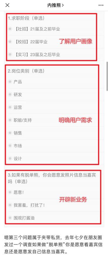 除了沉淀和社群服务, @内推熊 还会做精细化运营,定期对自己的用户进行问卷调查。