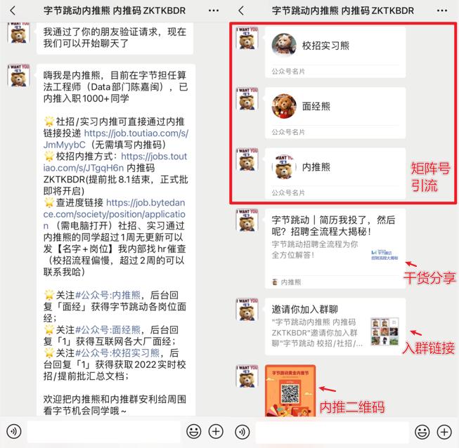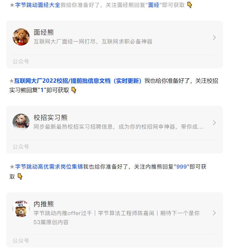 比如字节的“内推王”,算法工程师 @陈嘉闽 ,他的主要阵地就是公众号 @内推熊 。