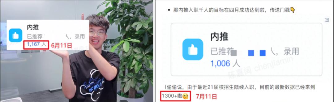 在今年 6 月 11 日, @陈嘉闽 已经内推 1167 人;仅仅过了一个月的 7 月 11 日时,内推入职 1300+人,入职人数增长了 100+ 。
