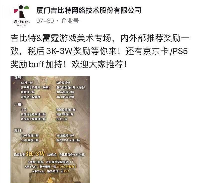 像米哈游、雷霆游戏等公司都有高金额外部推荐奖金。像这种外部推荐,只要有一个入职就有上万元奖金。