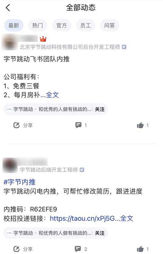 只要你点进公司主页,该公司员工的动态也被囊括其中;同时员工的动态下方会挂有公司的tag。因此,在脉脉上,我也看到了非常多内推消息: