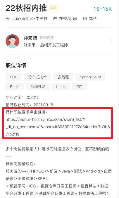 与此同时,有些大厂员工还会把官网职位链接放在「岗位职责区」 ( Boss直聘上显示职业详情的区域) ,就是这个位置: