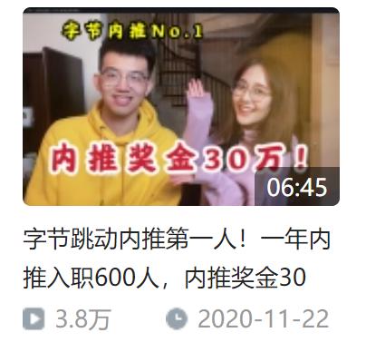 靠着公众号, @陈嘉闽 两年内推了 1100+人,“小赚”几十万 ,甚至他的照片都被放在字节官网秋招宣传片上。