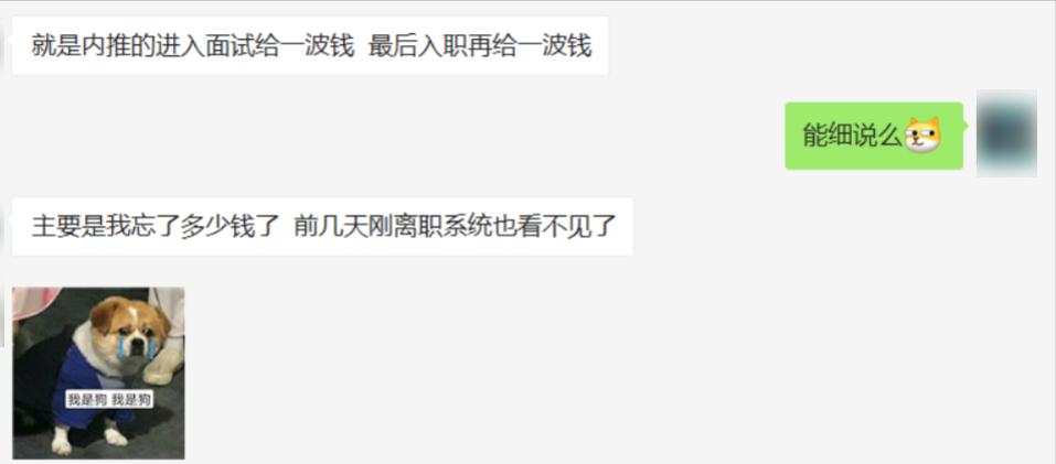 她告诉我,内推简历进入面试,就有一波奖金;入职之后,还有一波 (内推实习生没有奖金) :