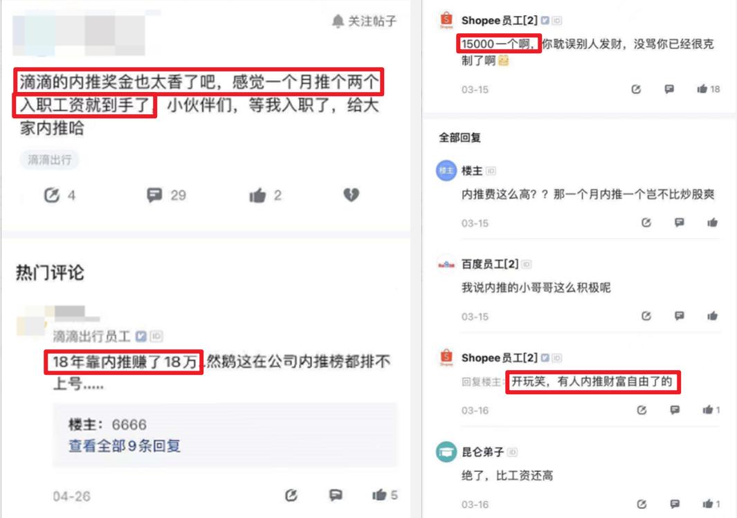 直到我在脉脉上看到两条消息:在滴滴内推两个人入职,相当于白嫖一个月工资;还有在虾皮的同学靠内推实现财务自由?