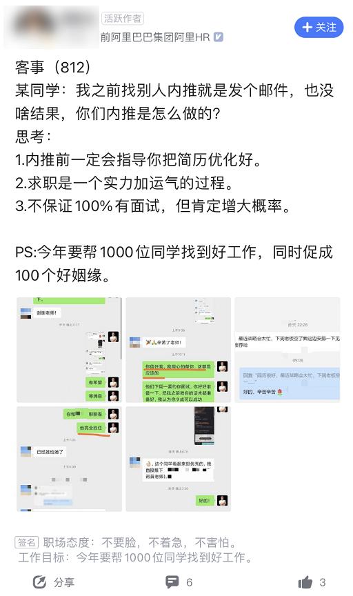 一方面,在他的社群里,每天都有「今日文章」及「内推职位信息」转发到群内。