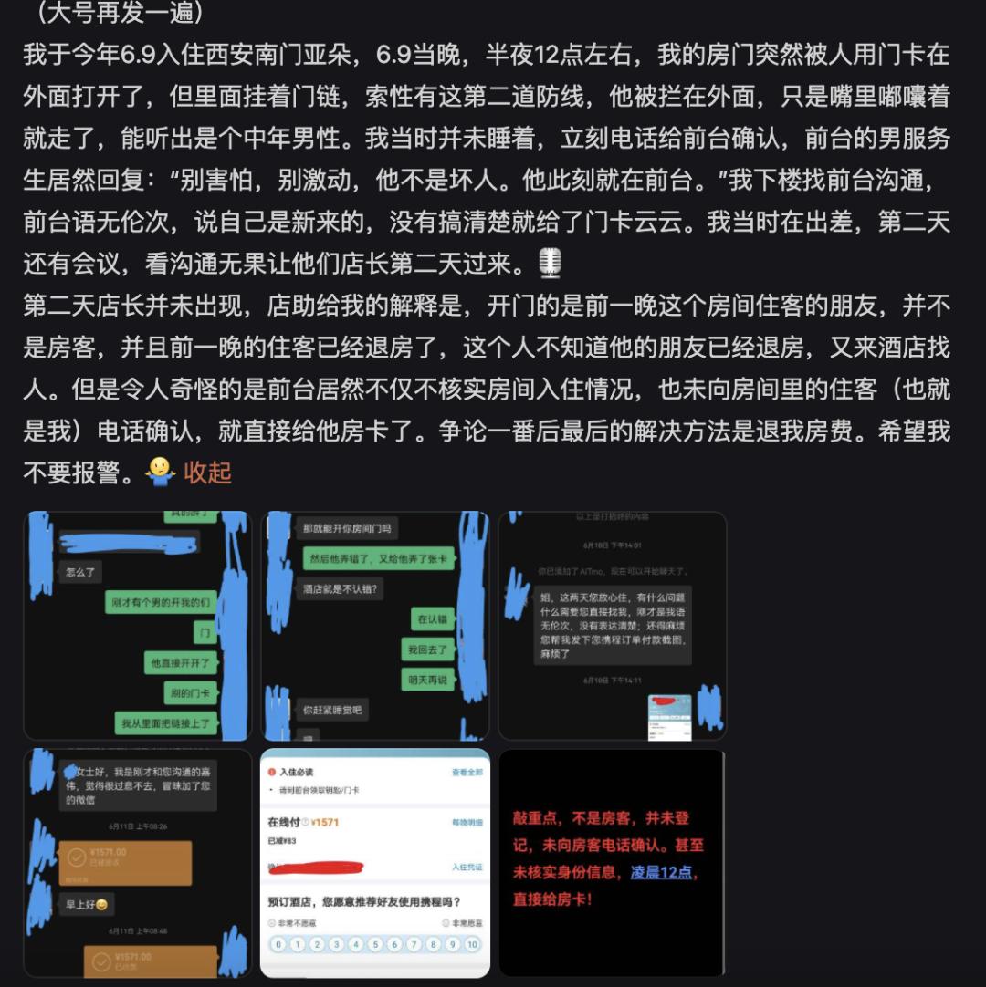 有网友在微博上发出自己在亚朵酒店遭遇陌生男子用房卡开门的经历。