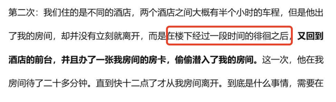 此外,根据阿里涉事女员工的8000字叙述,男领导曾在楼下徘徊了一段时间,随后再回到前台办房卡。