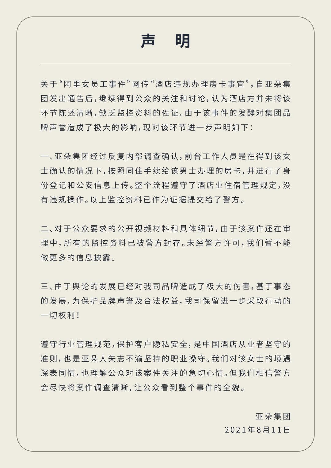 而后,母公司亚朵集团两天内连发两份声明,均强调该酒店工作人员不存在违规办理房卡的情况,前台人员是在得到当事人周女士本人的同意和确认之后,才按照同住手续给王成文(花名曲一)办理了房卡,还进行了身份登记和公安信息上传。