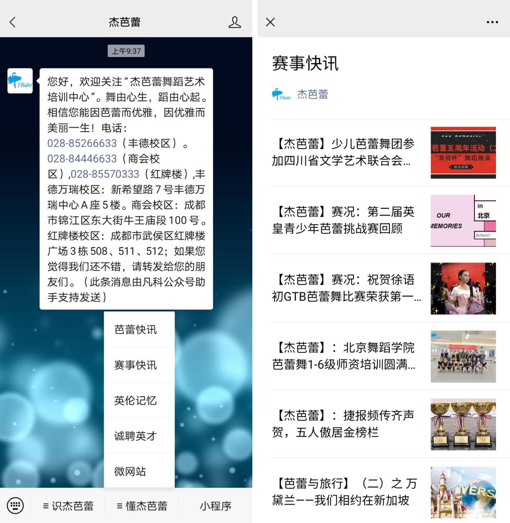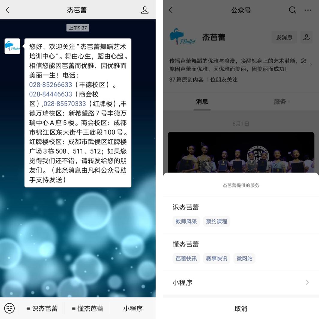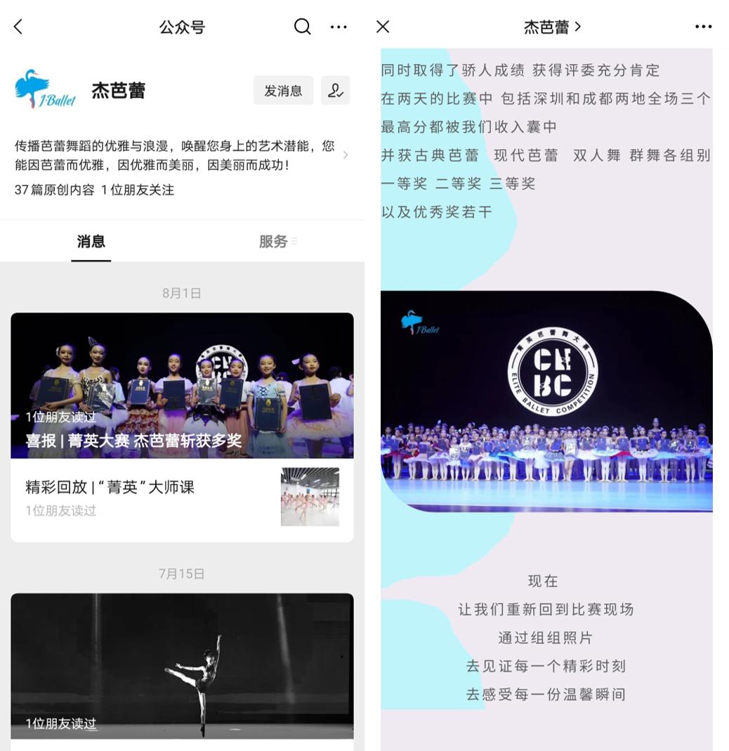 以「杰芭蕾」为例,作为一家芭蕾舞蹈艺术培训中心,教学的权威性与服务的专业性是其核心的竞争力。如何向外界传递品牌实力与服务内容,微信服务号就是其最好的窗口。