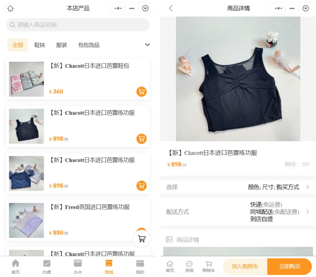 为了给予会员更好的体验,「杰芭蕾」甚至在小程序上线了一个小小的周边商城。这一类与芭蕾舞相关的服饰与鞋类,其实目的并不是为了能带来多大的销售,而是为了方便学员以备不时之需购买到合适的装备。