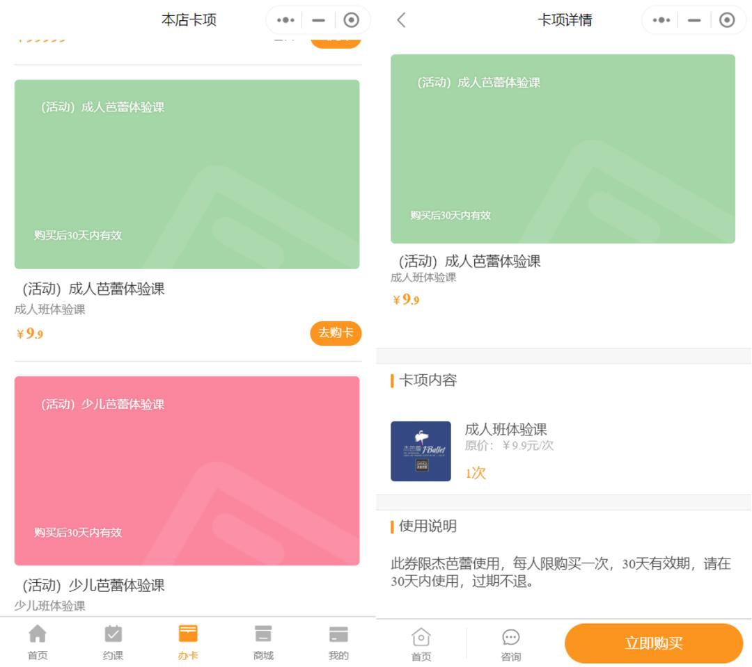 其二,低价体验卡与高价正课卡售卖,通过9.9元低价体验课作为引流手段,再推出正课会员卡提供购买。