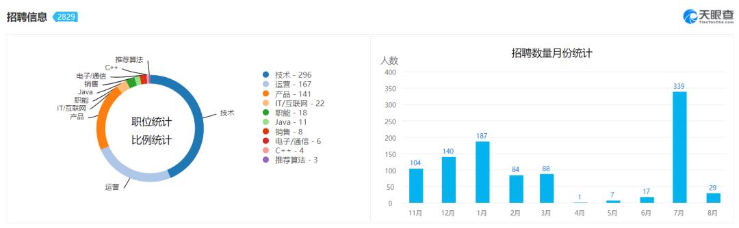 据天眼查专业版APP显示,快手的招聘信息中运营和技术占据很大的比例,这也符合快手做公域流量的目标,毕竟公域流量对平台的技术能力和运营能力也会要求更高。